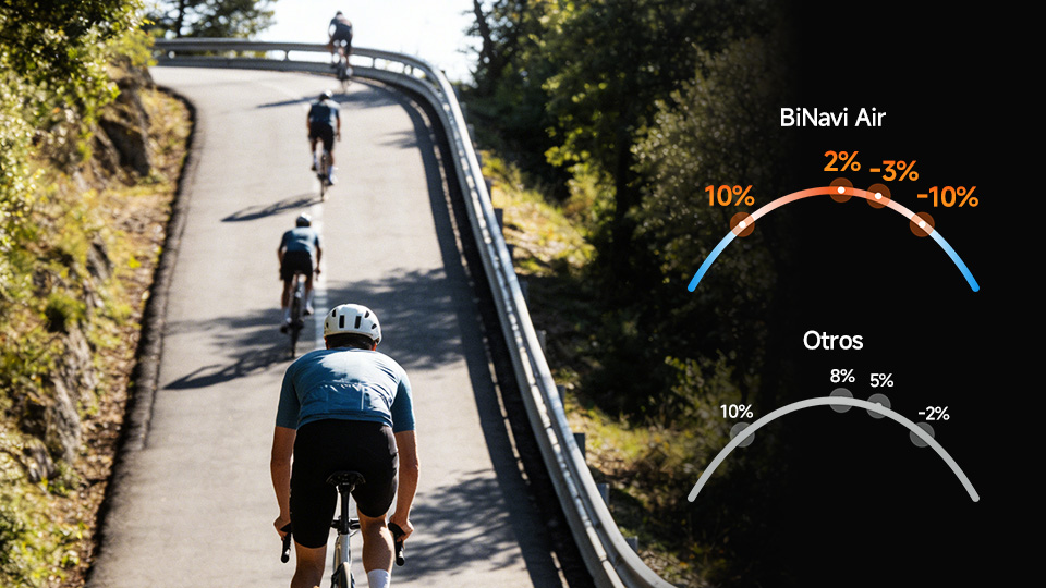 Lleva tus rutas a un nivel superior con el iGPSPORT BiNavi AIR, un ciclocomputador GPS diseñado para ciclistas exigentes que desean navegación de precisión, autonomía duradera y conectividad total. Con pantalla táctil a color de gran tamaño, múltiples sistemas satelitales y funciones inteligentes. BiNavi AIR se convierte en el compañero perfecto tanto para entrenamientos diarios como para aventuras de bikepacking o gravel. Pantalla táctil de 3,0" a color. Posicionamiento con 5 satélites a doble banda. Hasta 30h de autonomía. iClimb 3.0 (planificación de subidas). Navegación con mapas de alta precisión integrados. Recalcular la ruta. Entrenamientos y análisis. "Conexión a rodillos con función. admita ANT+ abierta. Di2 (control incluido), SRAM Etap, Campagnolo EPS. Conexión ANT+ y Bluetooth. Peso de 77 gramos.