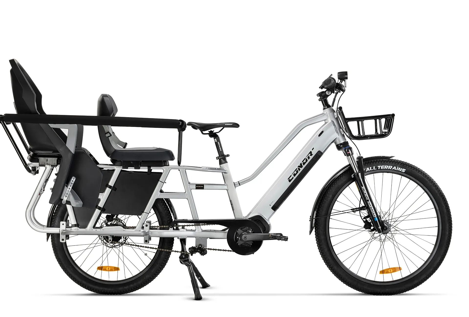 Una bicicleta de càrrega urbana per dur tota la família. La Conor Berna ve equipada per portar càrrega frontal així com dos nens a la part posterior. Centre de gravetat baix amb una fàcil maniobrabilitat. Motor Vinka amb bateria de 540WH per no tenir problemes d'autonomia a cap desplaçament urbà. Suspensió davantera, pota de cabra, llums i parafangs. Reposapeus posteriors per als passatgers. 7 velocitats. Roda frontal de 27´5 i posterior de 24", ambdues amples per aportar màxima comoditat. No et defraudarà. Amb barres de seguretat i coixins per als passatgers.